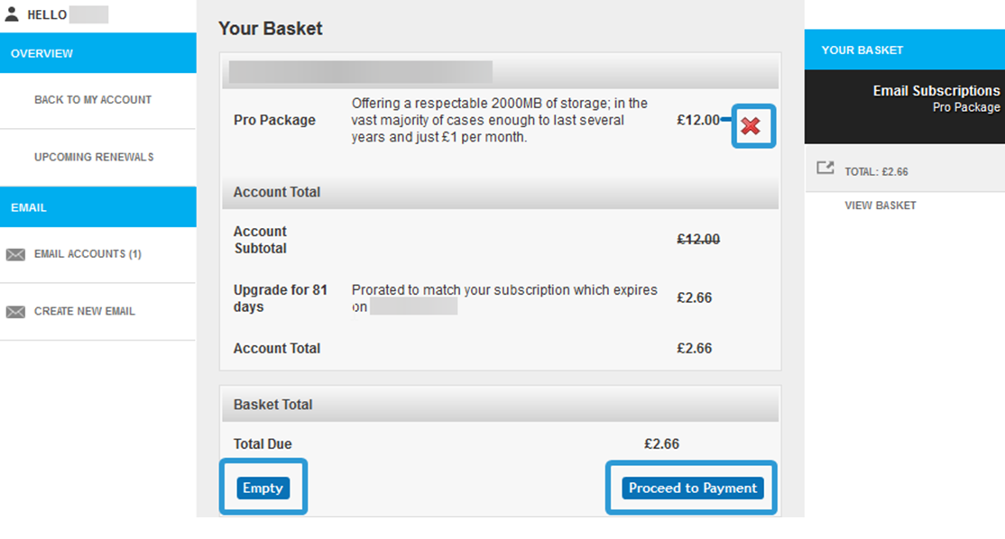 Your Basket will show all the Packages and Bolt-Ons you have selected, and show the total amount due for the upgrade. This is calculated on pro rata basis to match your renewal date. Click on Proceed to Payment if you wish to continue with your upgrade. Alternatively, you can click Empty to clear your basket or remove any items in your basket using the small red cross next to the item.