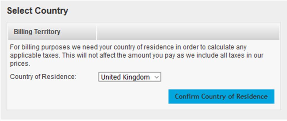 After clicking Proceed to Payment, you will be asked to pick your Country of Residence from the Dropdown. After you have done this, click Confirm Country of Residence to continue.