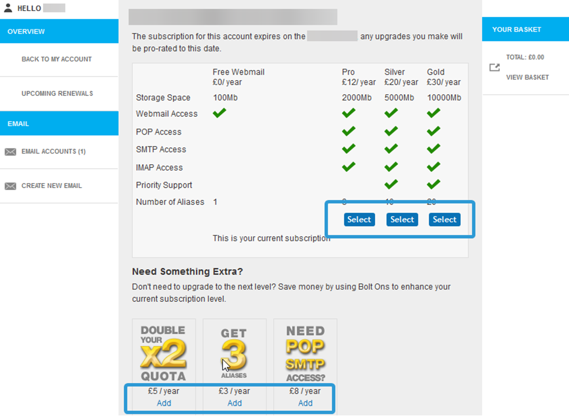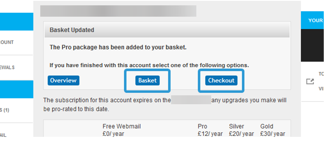 Once selected, the Packages and Bolt-Ons will be added to your Basket. You can click on Basket or Checkout to view details of the upgrades you have selected and continue with upgrading your Account.